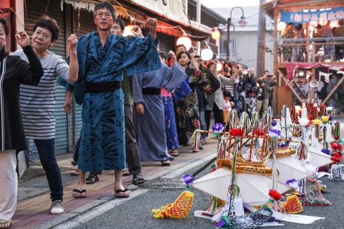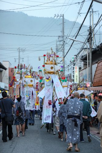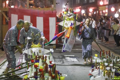 17日の明け方、櫓に並べられていた切子灯籠は降ろされて、行列の出発を待ちます。