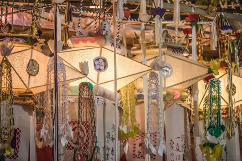 櫓(やぐら)の周りに飾られた切子灯籠は、この1年間に亡くなられた(新盆の)家庭から16日の夜に持ち込まれたものです。
