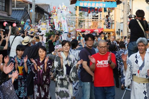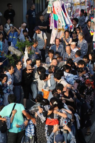 神事を終えて櫓まで戻ってきた行列。踊りを続けたい踊り手は踊りをやめません。