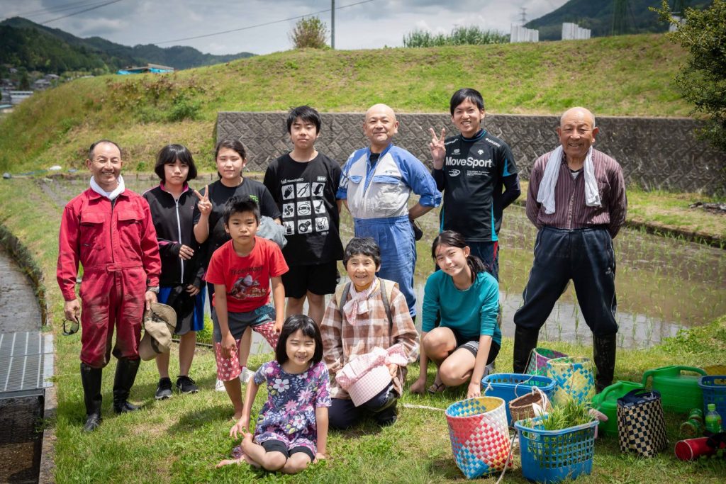 今年も無事田植え終了。小学生、中学生、大人が力を合わせてやり遂げた充実感の顔。