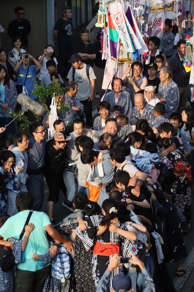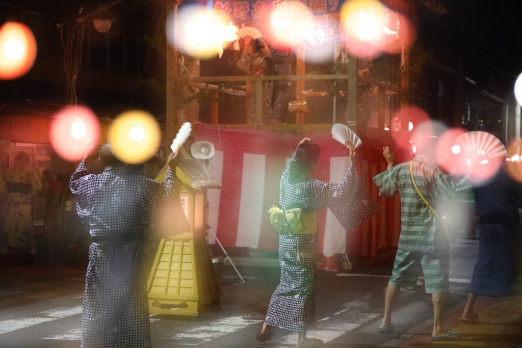 8月16日は、最も人出があります。踊り子は自由に輪に入ったり、踊り疲れたら休んだりしながら、全体としては、夜9時~翌朝6時まで一度も途切れることなく踊り続けます。9時間×4日(第3土曜日のうら盆も含む)=36時間!しかも肉声だけで鳴り物は一切使いません。もちろんCDなども使いません。生歌です。ノンストップ、オールナイト、コール&レスポンス、しかも櫓の上も音頭取りがアドリブで出す歌に、下の踊り子が「返し」をして、まるで百人一首の上の句、下の句のようにつながっていきます。これが、一晩中踊っていても飽きない理由でしょうか。歌は500以上あります。初心者は踊りをまねて踊るだけでも楽しいし、上級者は、歌を覚えてどれだけ返せるかを音頭取りと競い合うなんていう楽しみもあります。私たち音頭取りはよくみています。「あの人は、よく歌を返してくれるな。」「この子はいい声が通るな。」「毎晩来てよく踊っとるな。」「朝までがんばっとるな。」などと有名人になっていき、実力がついてくると音頭取りとして推薦されるのです。 最近は、東京方面から毎年来てくれるコアな踊り子さんがいてうれしくなります。今年はちょっと我慢して、その分は来年2年分、思いっきり踊ってくださいね。