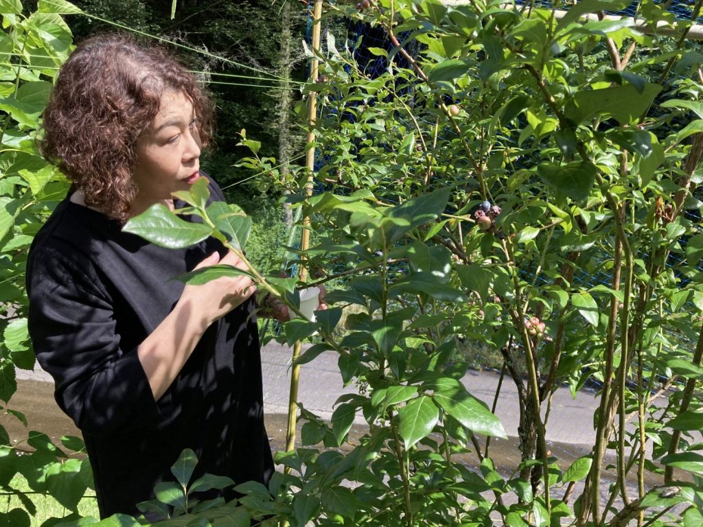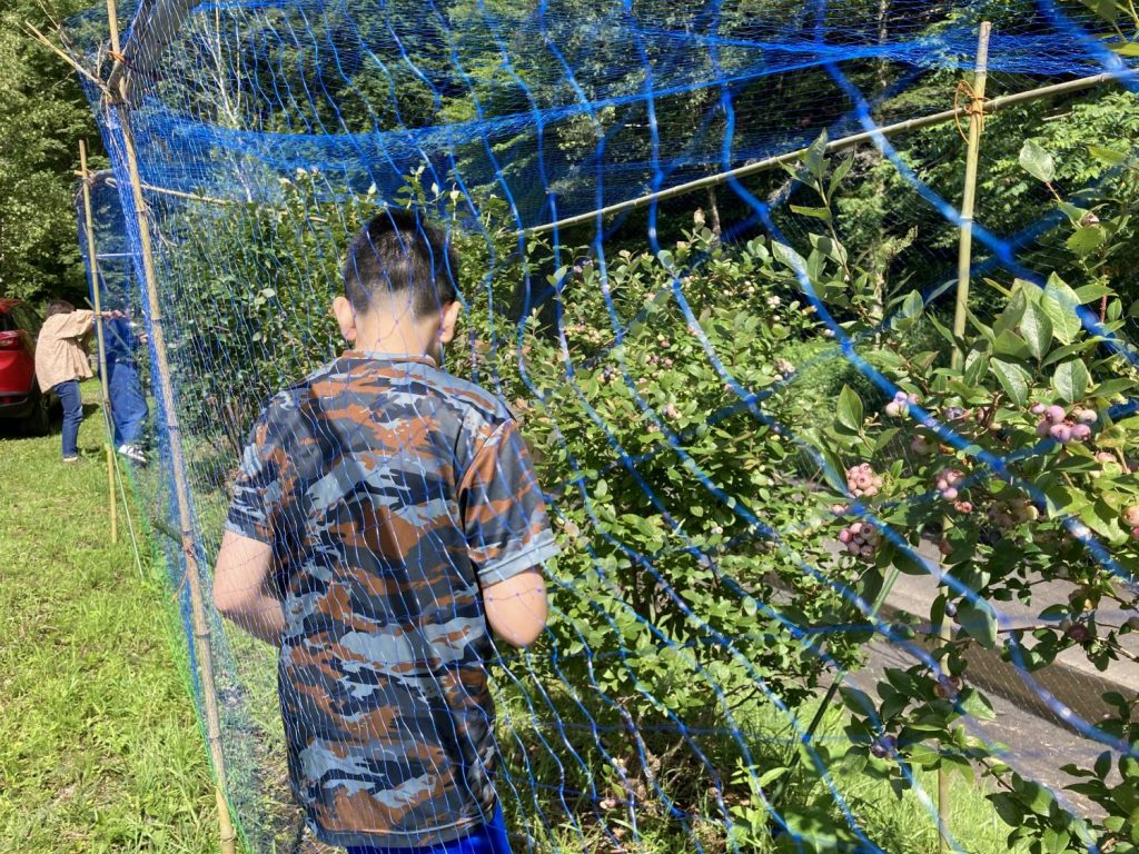 ちょうどブルーベリーが最盛期。みんなで庭のブルーベリー狩りを楽しみました。木から直接、大きくて黒いブルーベリーを取ったY君。