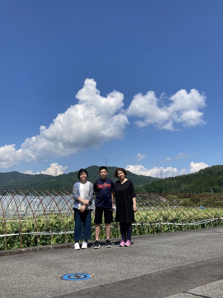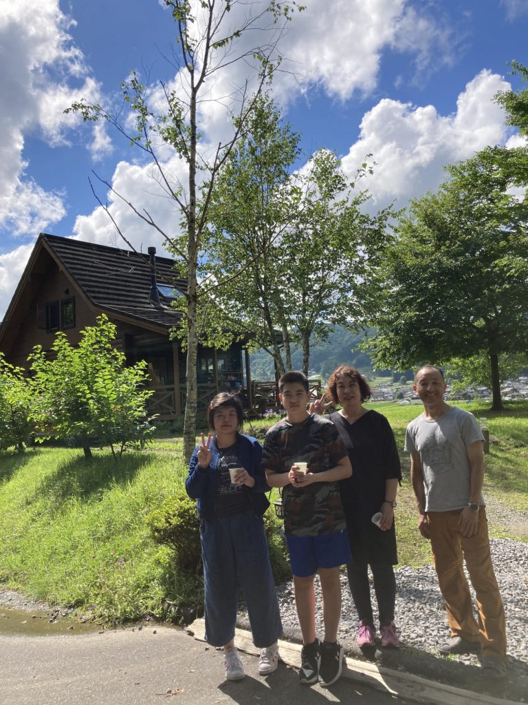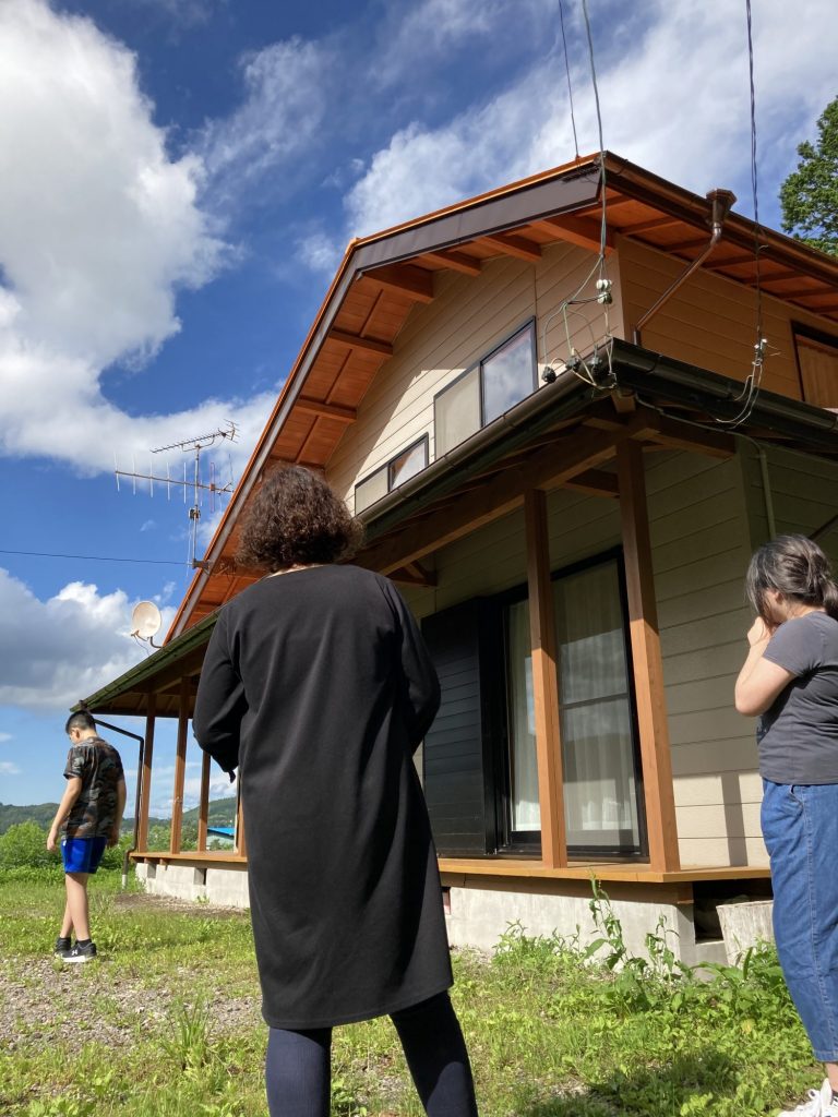 大雨の後の青空は、本当にきれいな色です。緑とのコントラストが爽やか。ログハウスカサビエントの前でTさんご家族と親子山村留学の事務局の私(金田)と。