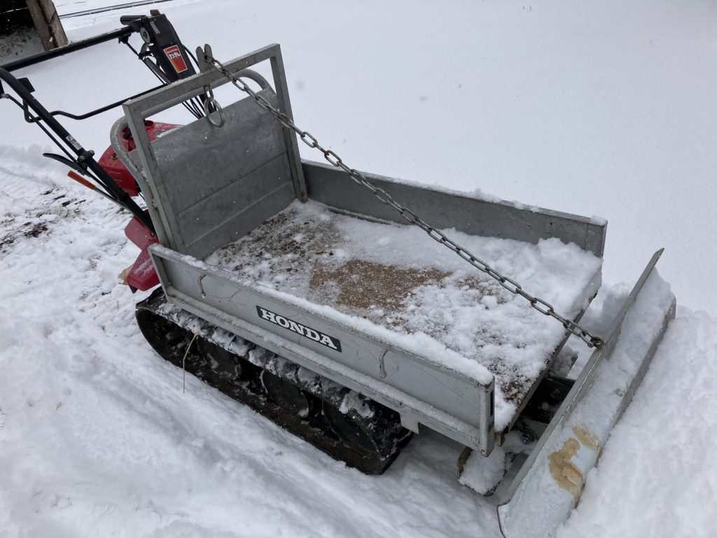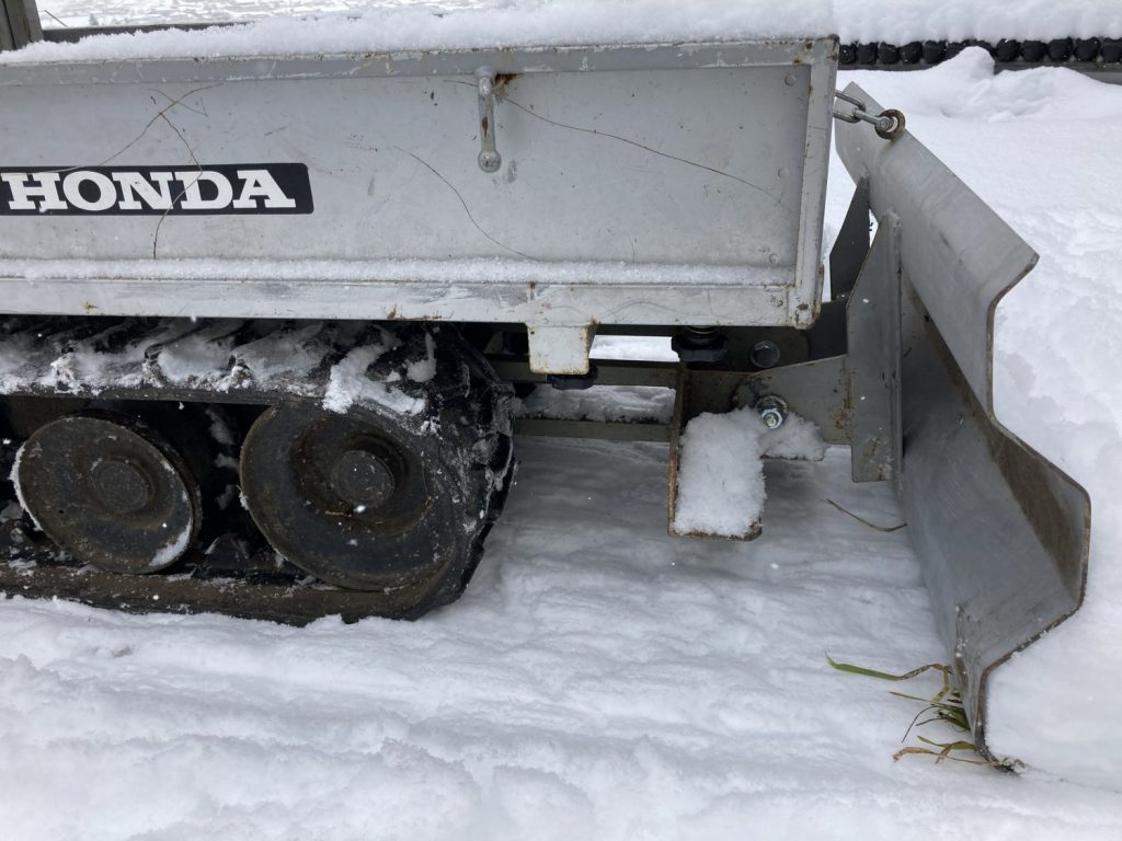 薪運びに大活躍した運搬車に除雪ブレードを取り付けると、除雪車になります。 3万円で新野の鉄工所(OHTECH)に改造していただきました。広い敷地の除雪に威力を発揮します。