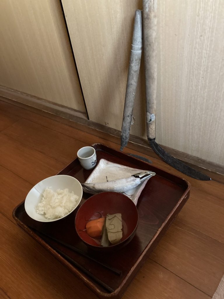 15日小正月の朝、日頃使っている鎌、草かきなどの刃物類の道具に感謝し「道具の年取り」をします。道具の神様に、新米で炊いたご飯、イワシ、大汁(新野の年越しの昆布だし野菜汁)、お酒をお供えします。