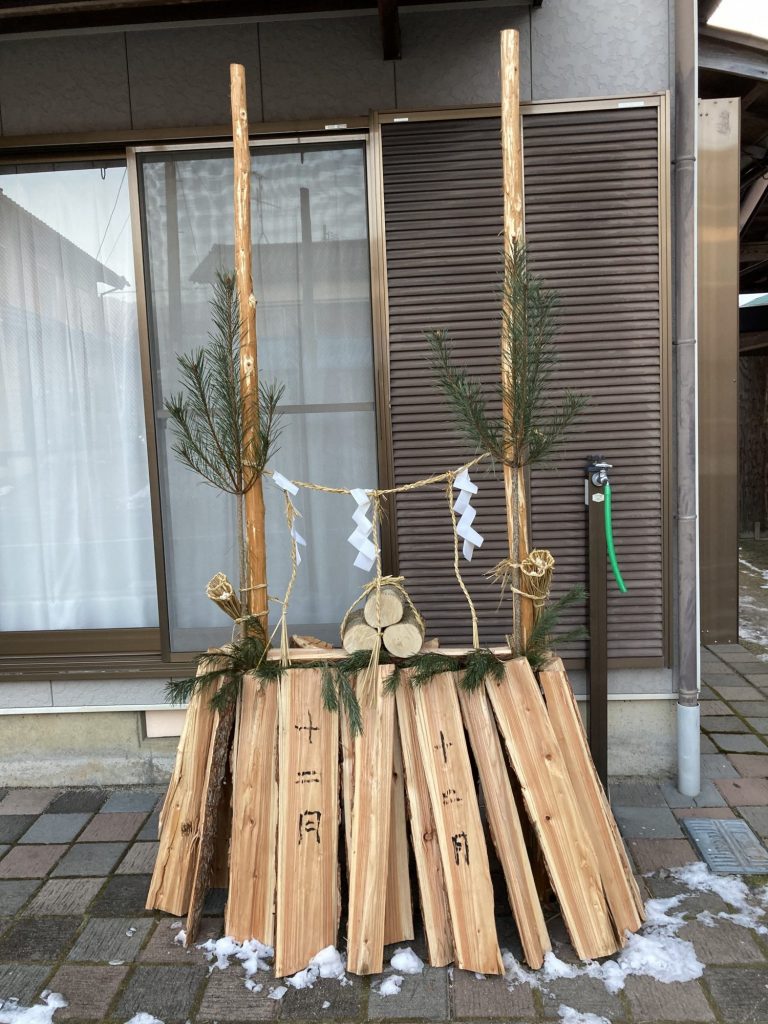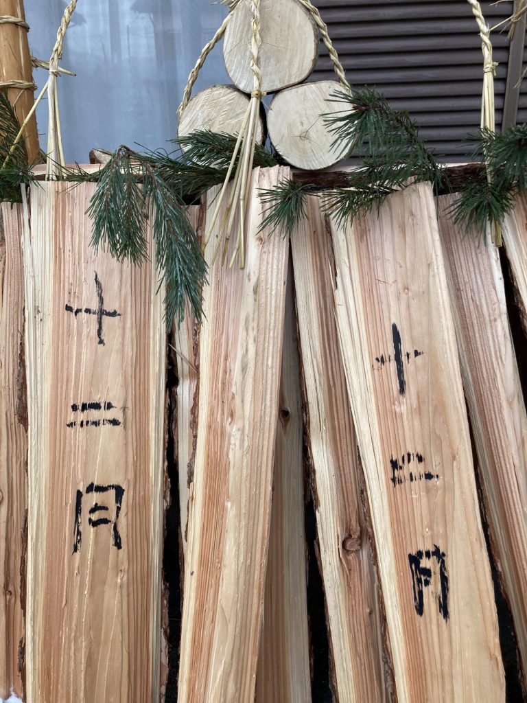 1月14日の朝、1年中の家内安全を祈願し、門松の「若木(わかっき)」に「十二月」と墨で書きます。これを「オニを書く」と言います。