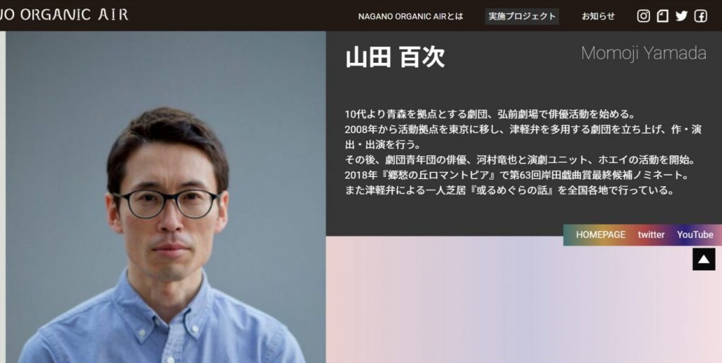 阿南町新野に滞在されるアーティストさんは、『山田百次さん』。青森県出身の戯曲作家、俳優で、津軽弁を使った戯曲『或るめぐらの話』を創作され、全国各地で一人芝居をされています。第63回岸田戯曲賞の最終選考までノミネートされたアーティストさんです。