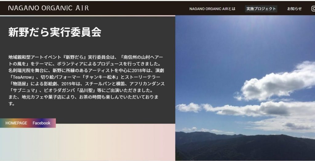 長野県文化振興事業団・長野県による「NAGANO ORGANIC AIR」の文化芸術創作活動が、阿南町新野を中心に行われることになりました。長野県内8か所の最南端です。