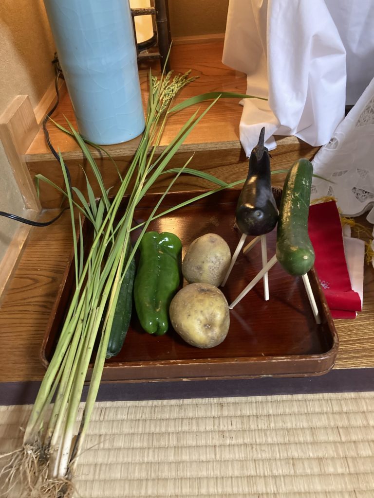 8月15日の深夜24時に、各家の仏様を送ります。仏様は、あの世から家に戻るときは足の速いキュウリの馬に乗ってきて、あの世に帰るときは足の遅いナスの牛に乗って帰られます。あの世までの道中、お腹がすかないように畑で取れた野菜やお米をお供えして、一緒に送ります。