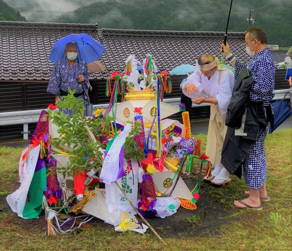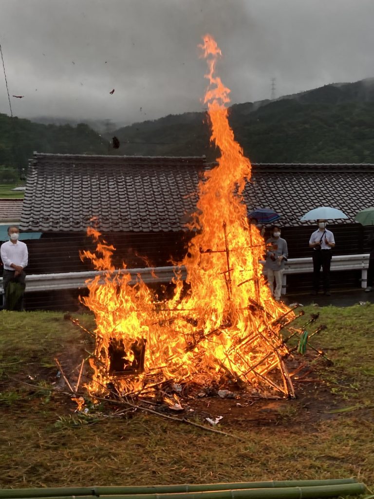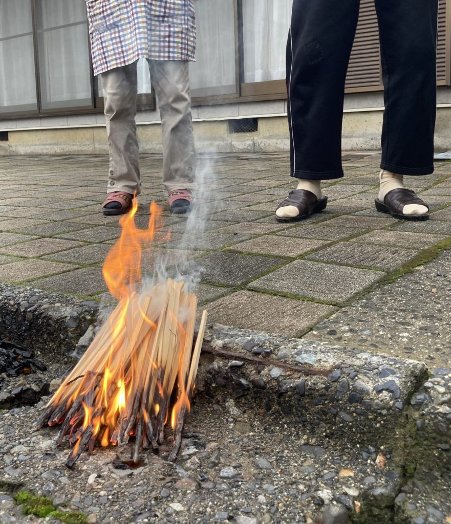 家ごとに仏様を送る場所は決まっています。近くの小川のほとりで、盆茣蓙に包んできたお供え物とともに、松明を焚いて、線香を供え、お経を唱えます。「ナンマイダー ナンマイダー ナンマイダーブツ ナンマイダ。ナンマイダーブツ ナンマイダーブツ ナンマイダ。」これを鉦に合わせて3回繰り返します。(今年は豪雨の為、家の庭で行いました。この写真は令和2年8月15日のものです。)