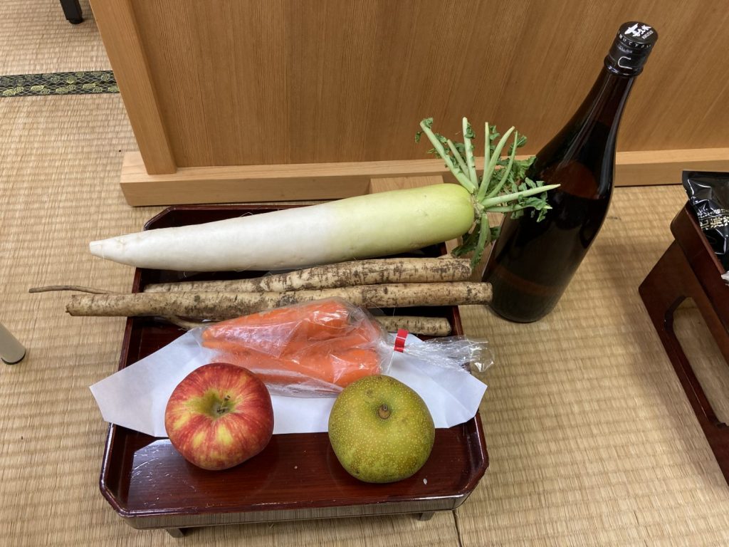 8月17日未明は、踊り神送り(市神様)と新盆の新仏様の送りが行われました。通常は、盆踊りによって盛大に送られるのですが、今年は新型コロナウィルス感染拡大の為、神事のみが執り行われました。これは市神様へのお供え物です。