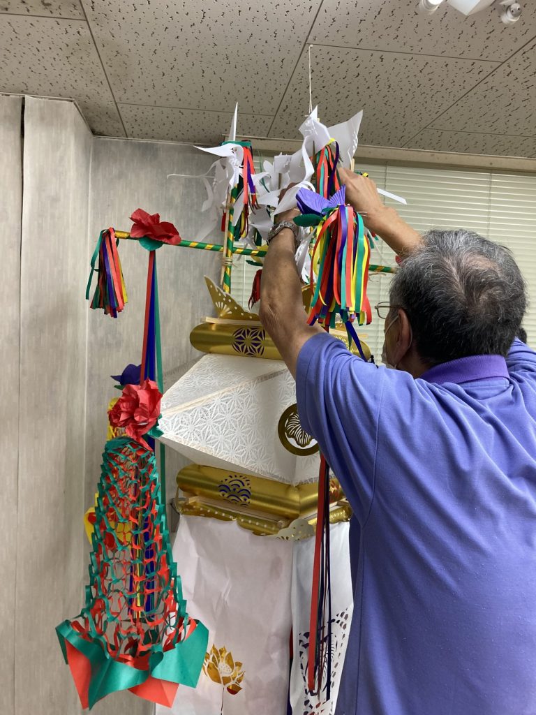 送りの行列の先頭になる灯篭には、御幣がつけられます。お盆の行事は仏教の行事なのでカラフルな灯篭の飾りなのに、神道の白い御幣を付けるのです。ちなみに神道の家の灯篭は、色紙を使わず白い中折で飾られています。仏教・神道・その他どんな宗教の家の御霊も希望があれば、平等に送ります。