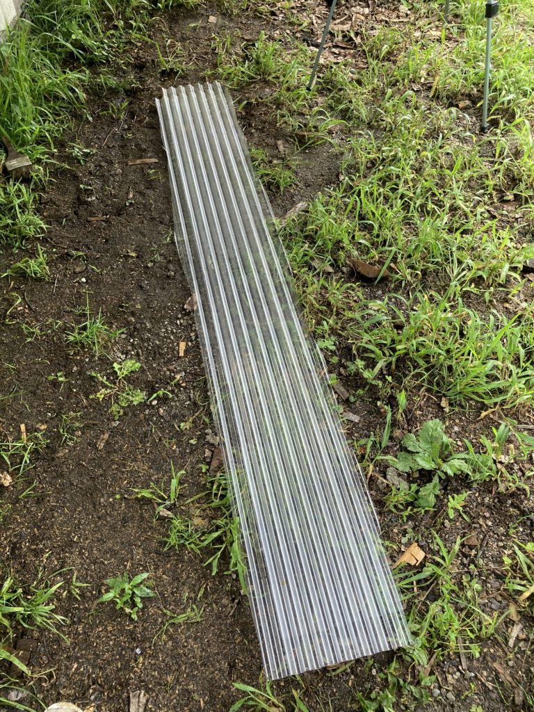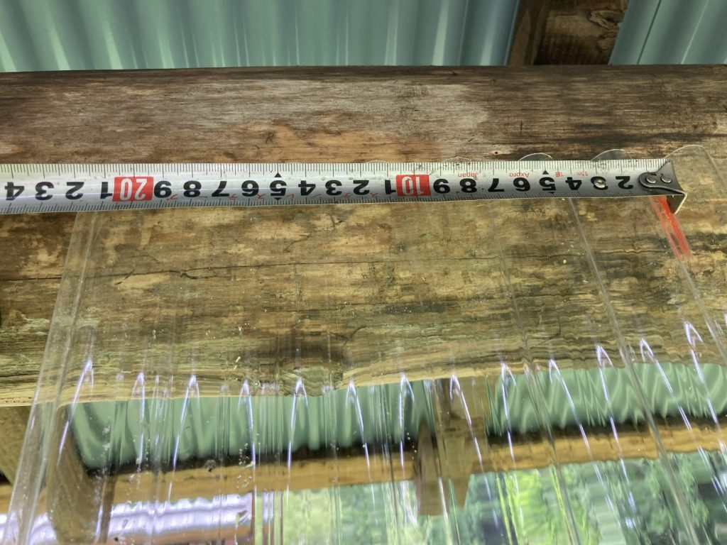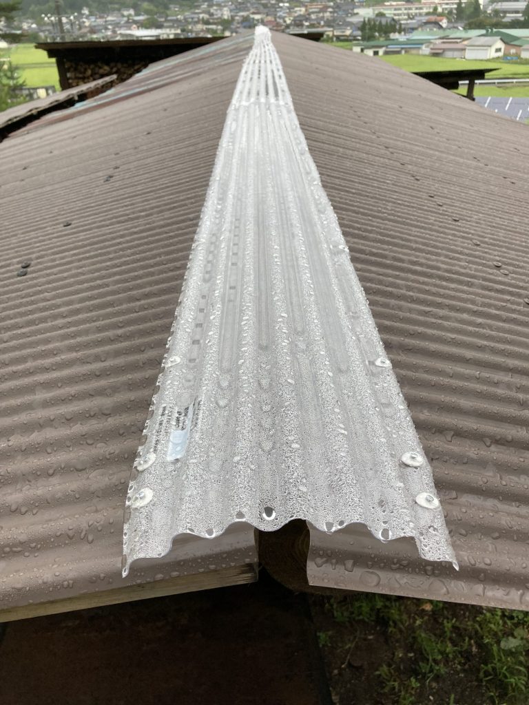 ポリカーボネイトの透明な波板6尺ものを3等分し幅21cmにすると最も効率よく材料をとれますし、棟カバーとして最適です。