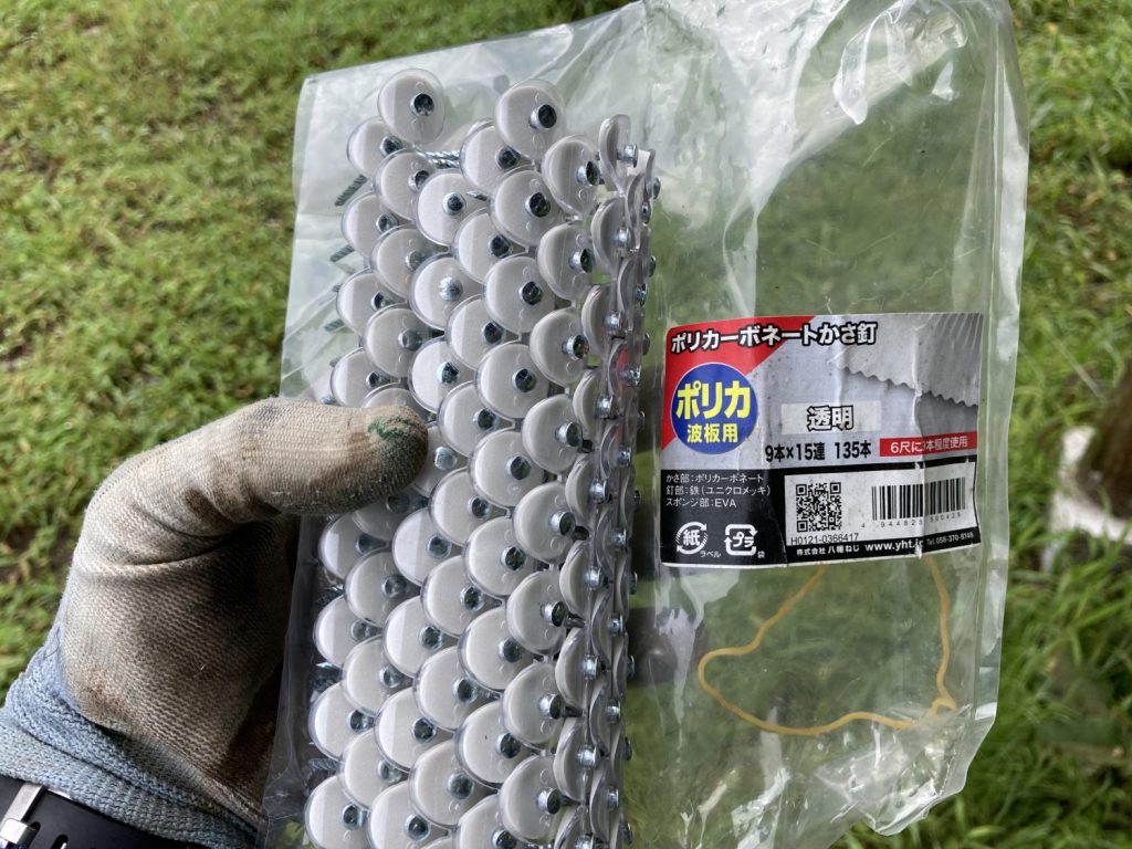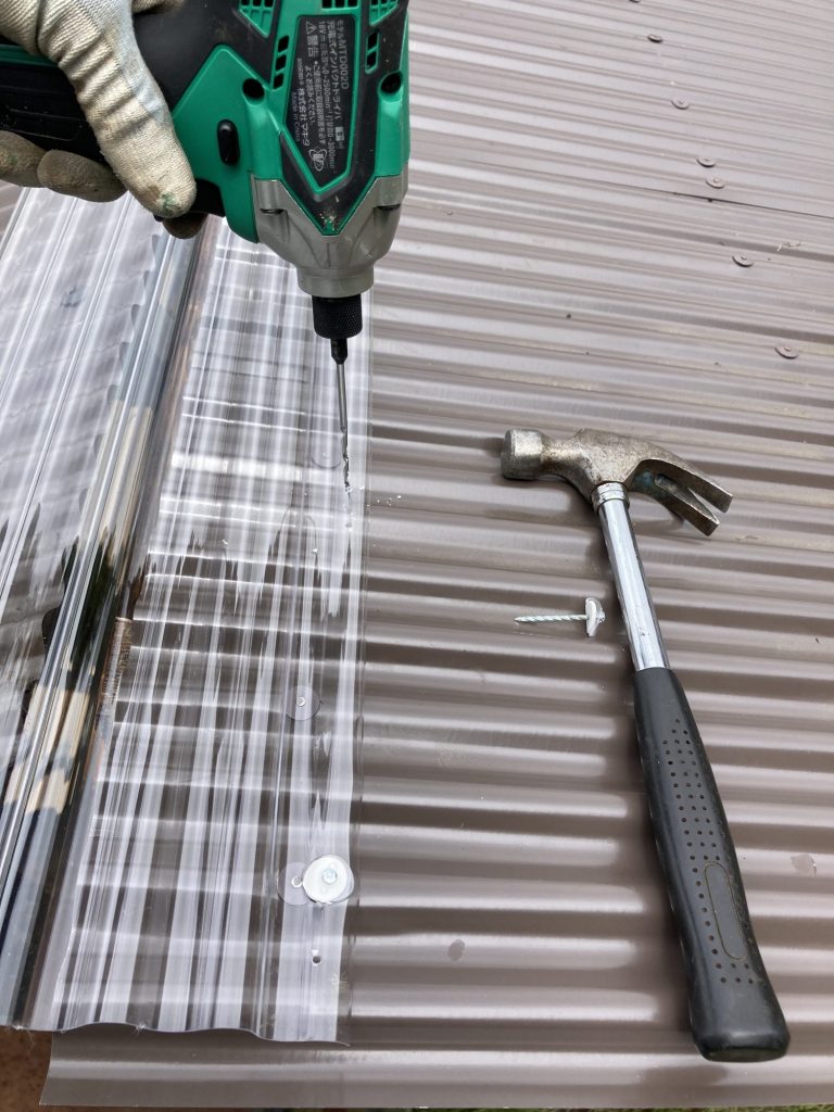 はじめ下穴を開けていましたが、慣れてきたらカサ釘を一発で打てるようになりました。打つ位置はポリカの山の部分と波板の山の部分が重なっているところです。