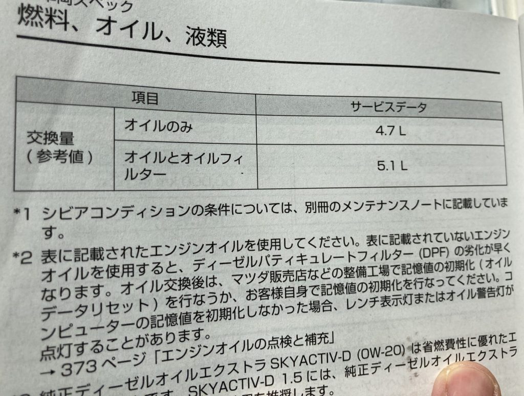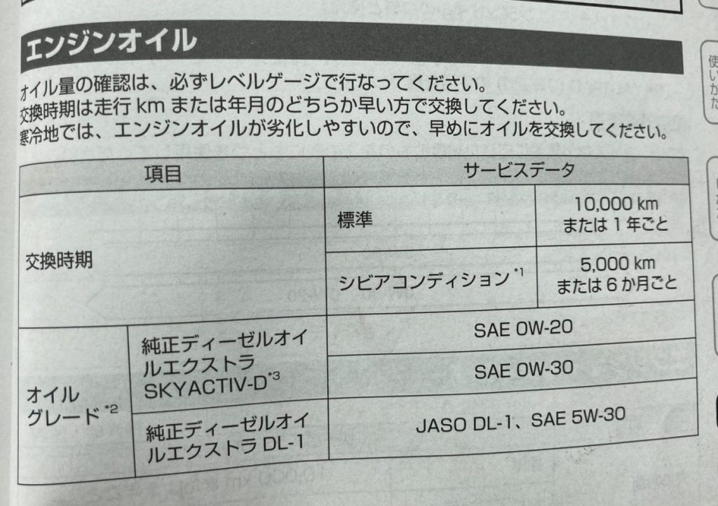 マニュアルでは、DL-1はSAE5W-30で推奨です。少しSKYACTIVEーD 0W-30より粘度が高い分、燃費はわずかに落ちますが、エンジンへは優しいオイルです。エンジンの耐摩耗性が向上しますね。