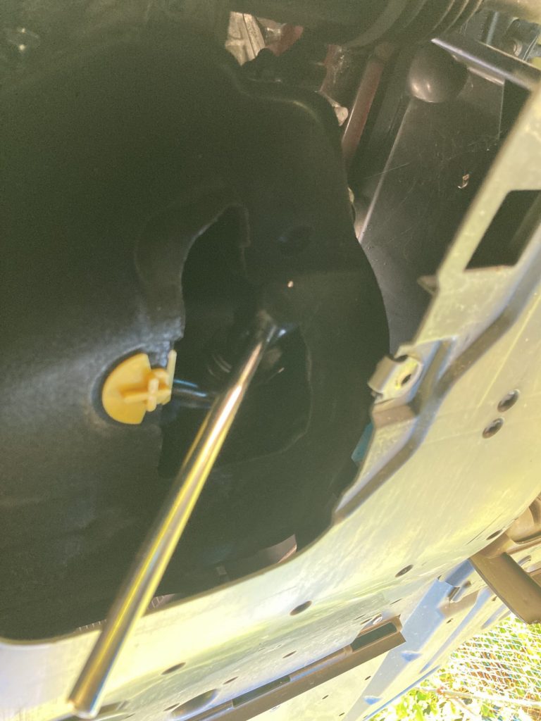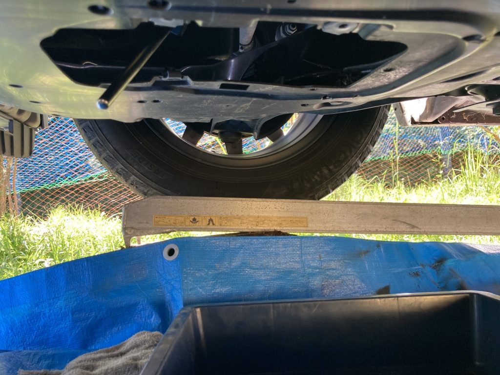 ドレーンボルトの斜め後方にオイル受け皿を置きます。結構、勢いよく飛び出します。