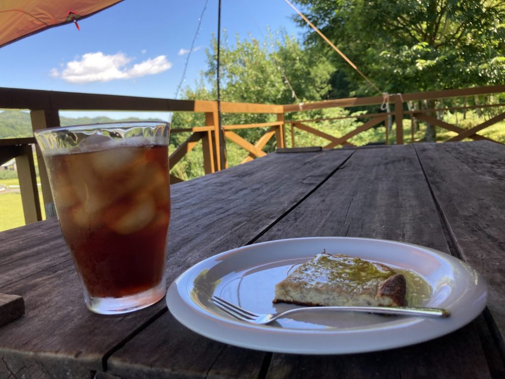 ここで10時の休憩。アールグレーのアイスティーに妻の手作りバナナケーキ。