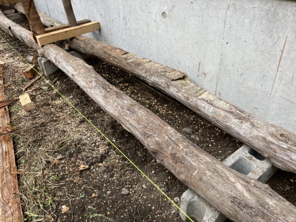 次に、何十年も田んぼの「稲架(はざ)」として使われていた栗の木の丸太を置きます。水平をできるだけ取って、横桟を130mmコーススレッドで固定します。
