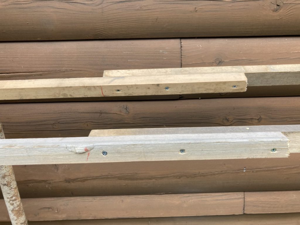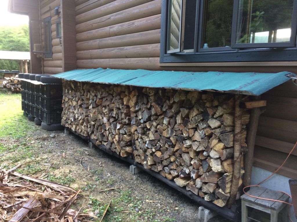 廃材でお金かけずに薪置き場を作りたい方、自己流ですがご参考までに。あくまで1~2ヶ月以内に使う薪用です。生木を長期間ログ壁の近くに置き乾燥すると、シロアリの心配がありますのでご注意ください。生木からの2~3年の乾燥用薪小屋は、ログハウスから離してあります。