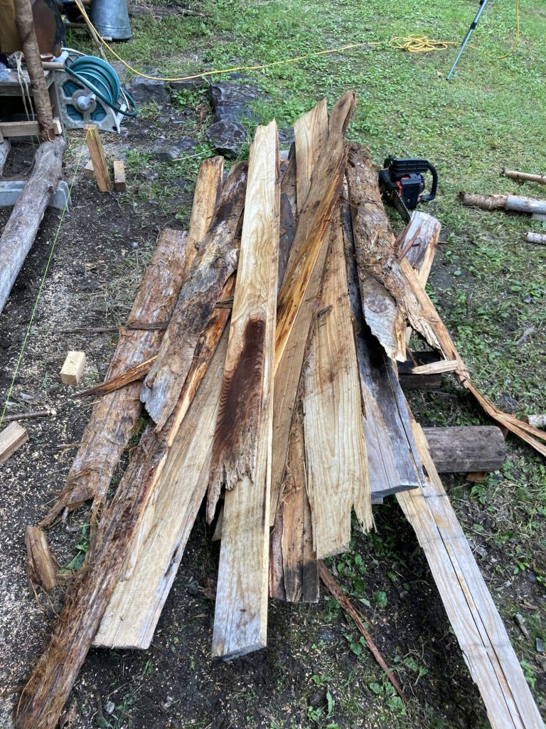 そこで、もう少し自宅の脇に雪の日でもすぐに取りに行かれる薪の仮置き場を作りました。でも、お金かけたくないし、ある物を再生してゴミを減らし、物の価値を生かしてあげたい。薪が雨に濡れる前に1日で作りたい。今回は、ショートムービーでなく、丁寧に作り方をレポートします。
