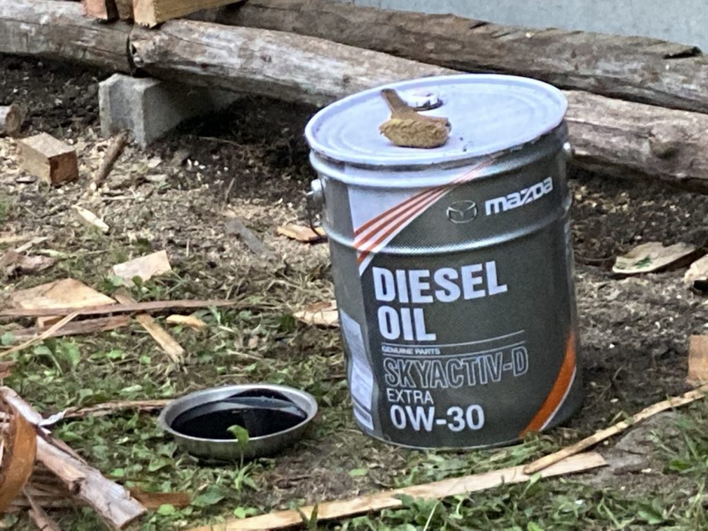 ディーゼルエンジンは、真っ黒で、割とサラサラしています。さすがマツダの純正0W-30。良くしみ込みます。