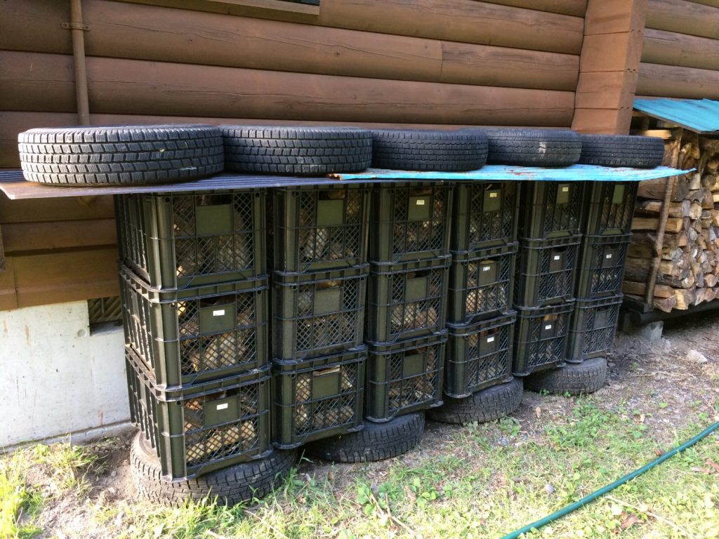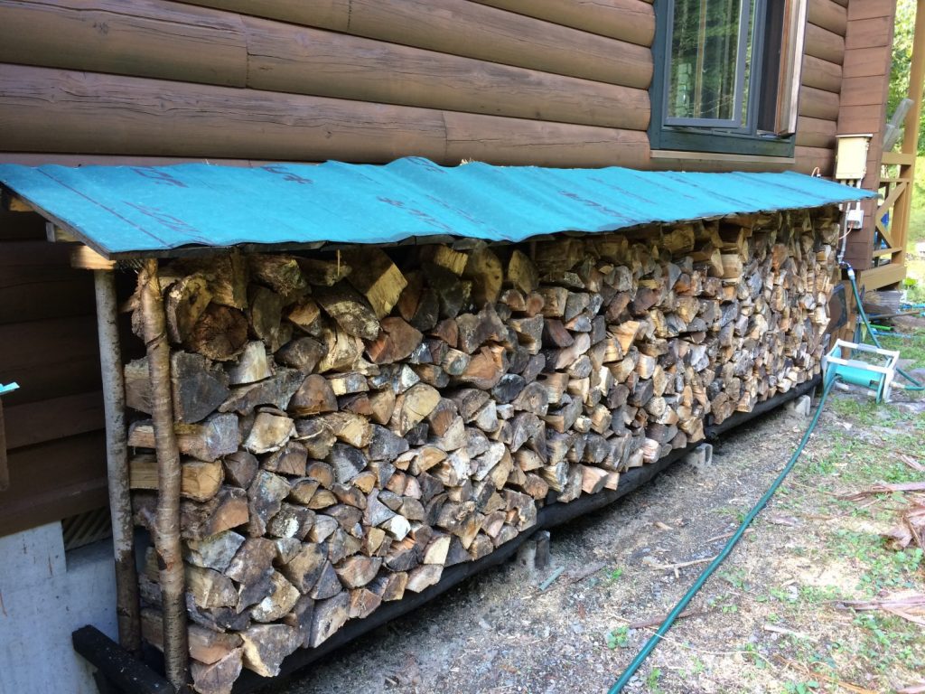 コンテナに古タイヤ&ホイールをしてに敷いて、中古波トタンをかけて、古タイヤで重しにすれば30分で、簡易薪置き場の出来上がりです。このまま、室内に持ち込んで細かい端材は焚きつけにします。