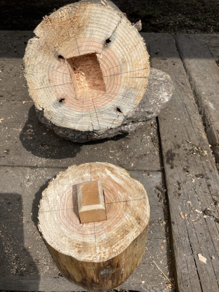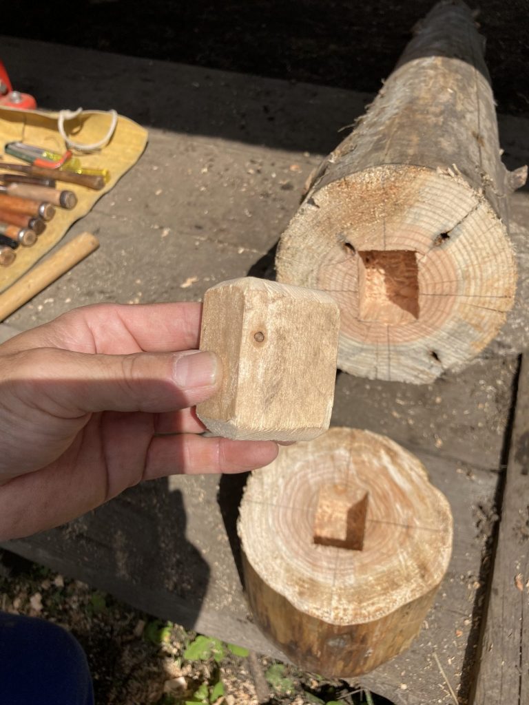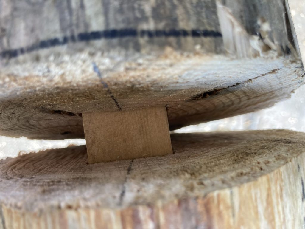 そこで、柱のジャッキアップに初挑戦しました。継ぎ足した柱がずれないように、実(さね)をいれました。余った垂木の端材です。