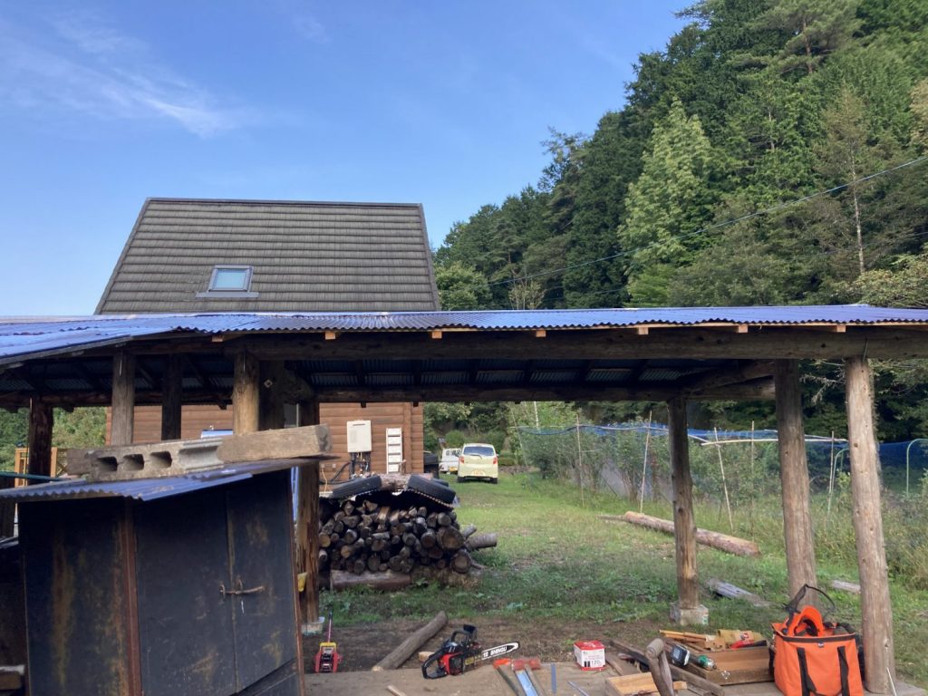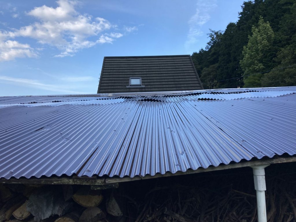 無事完成!見事屋根が面一になり、水平を回復しました。丸太の掘っ立て小屋は、永久的な建築物ではありませんが、施工も簡単で材料も少なくて済みます。このように修正も楽なので直しながら使っていくものだと思います。最後は、材木は薪になり、波トタンは薪の仮置き場のカバーに使えます。