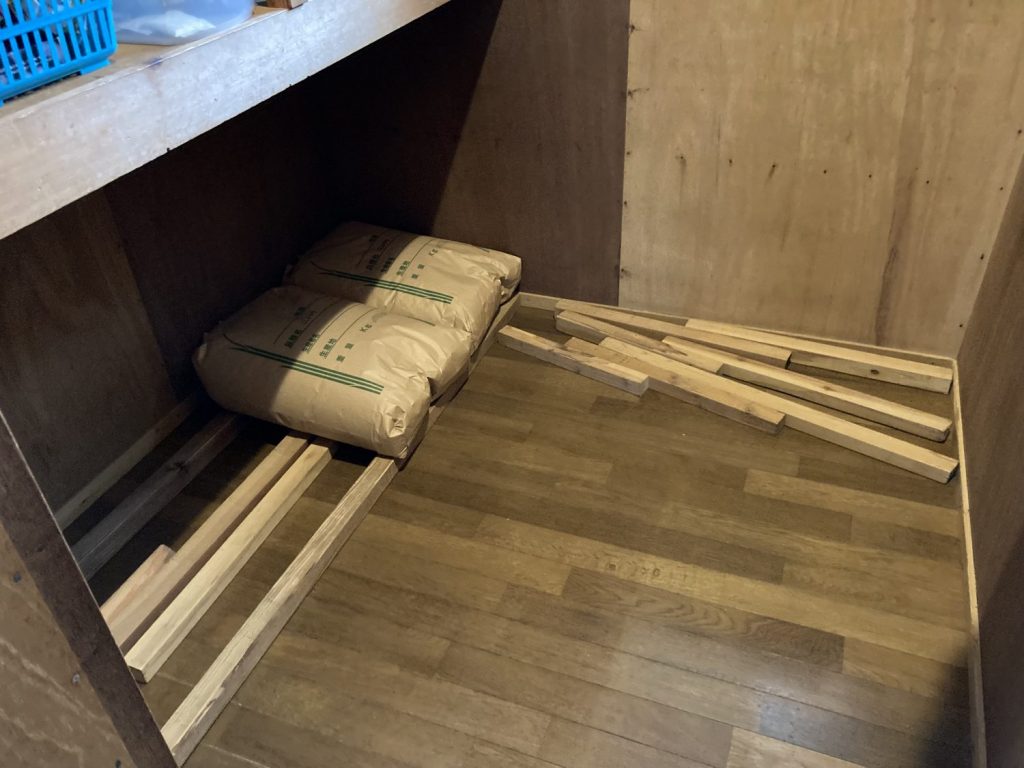敷き木(垂木の切れ端)で、空気が通るようにします。カビ、虫、湿気からお米を守ります。