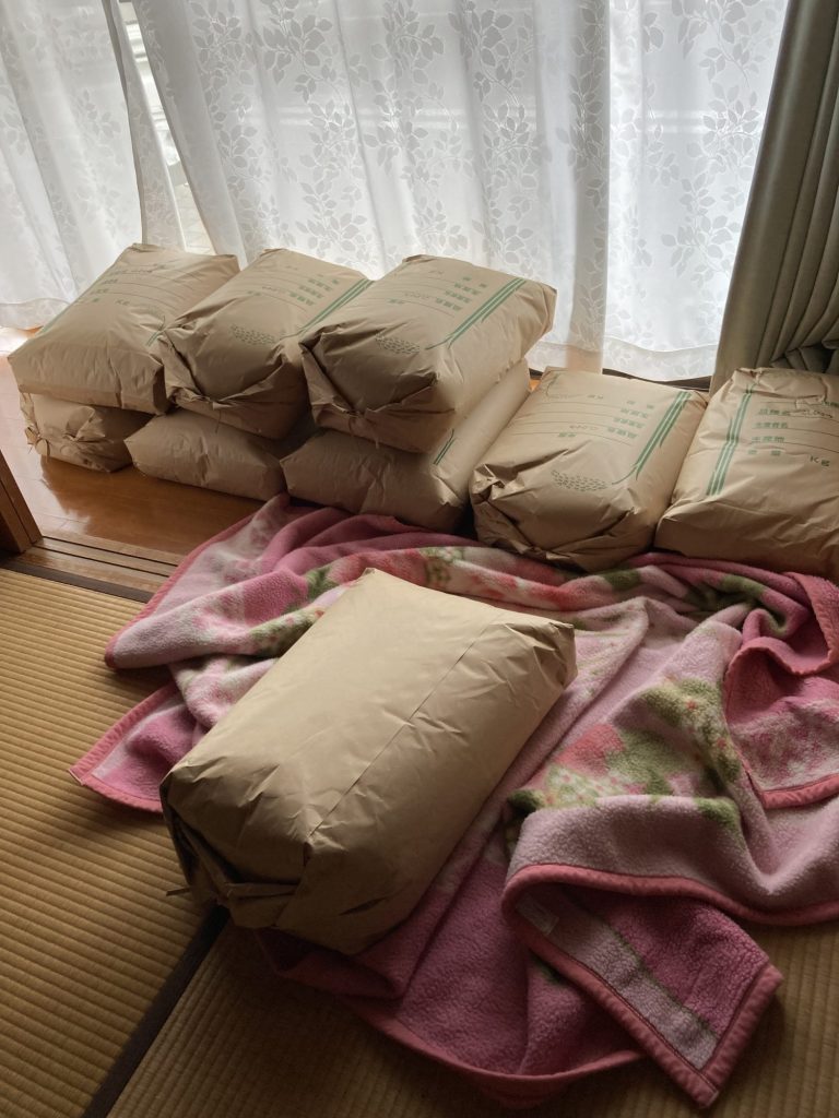 こんな天空の南信州新野高原(長野県下伊那郡阿南町新野)で作った新米が、昨日、玄米で届きました。コンバインで刈り取って次の日には乾燥して、玄米の状態で30kgの袋詰めで届きました。全部で16袋でした。昨年は、22袋でした。今日は、物置に収納します。