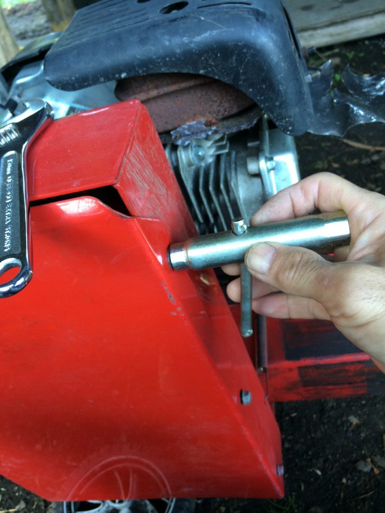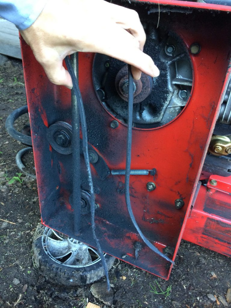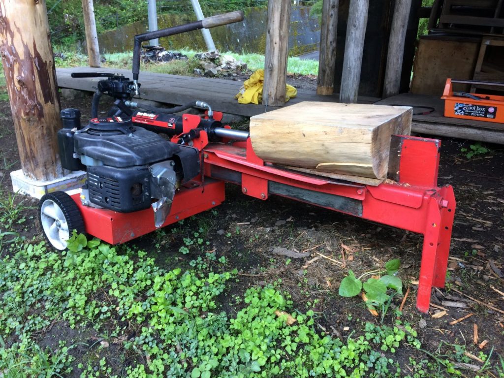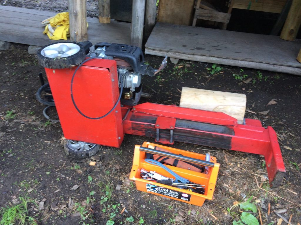 固い松の木のブロックを割ろうとしたら、MTDの8t薪割り機が突然ストップ。これは、おそらくVベルトが切れた!