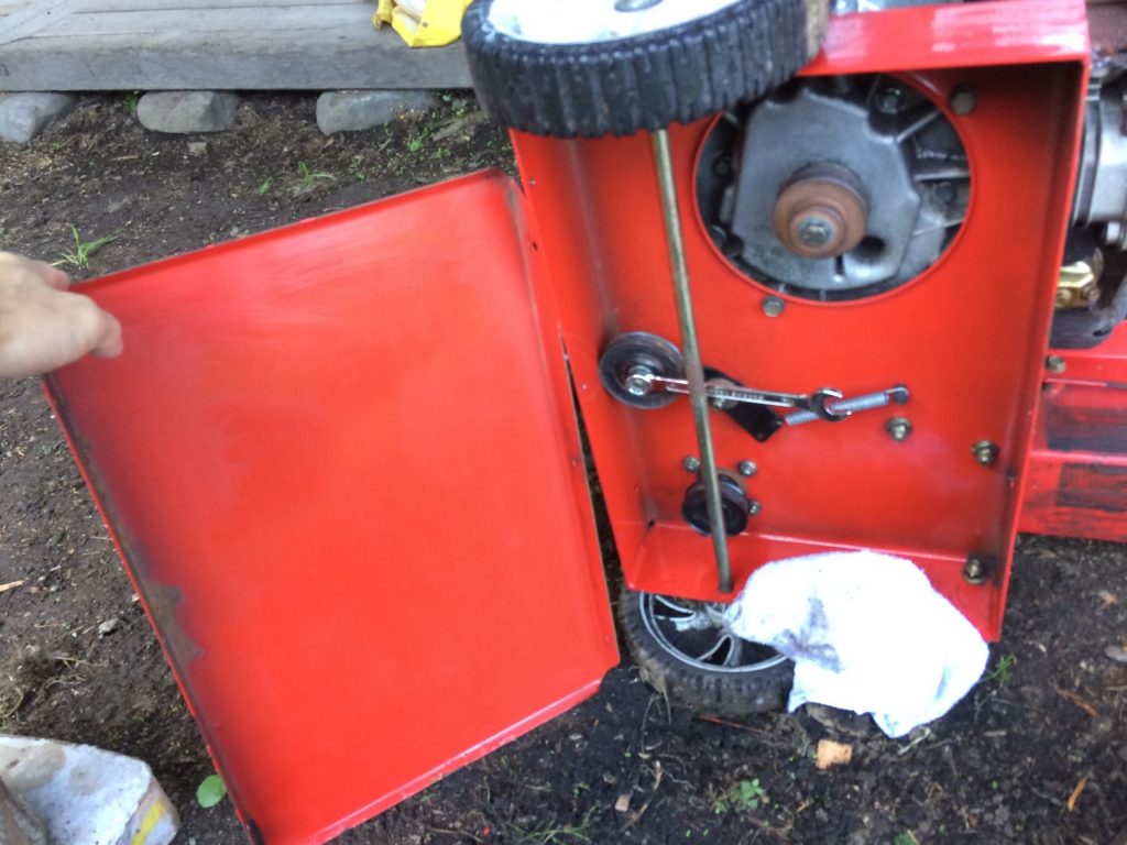 Vベルトを買ってきて自分で交換してみました。ベルト代だけなので安くできます。まずは、横倒しにします。