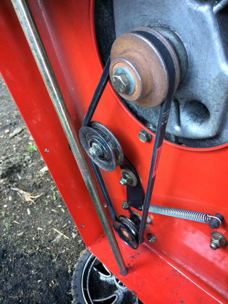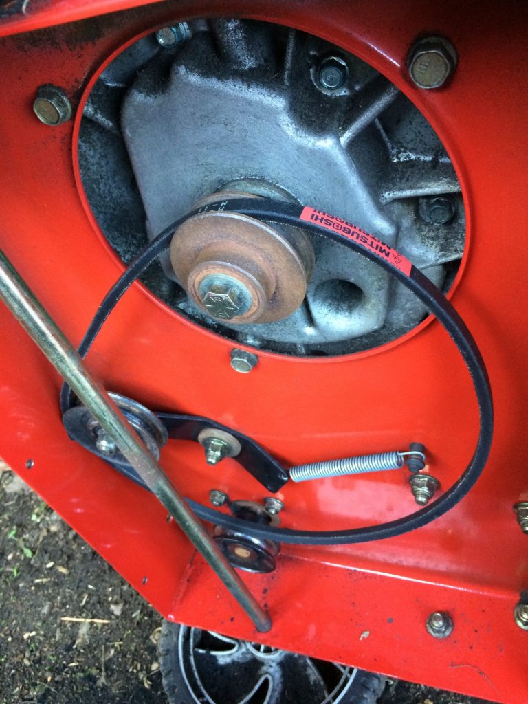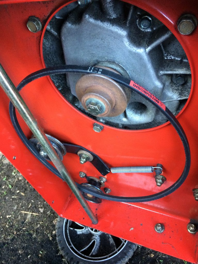 最後に油圧ポンプのプーリーにかけます。可動プーリーを引っ張りながら、プーリーを回転しながらはめるのがコツ。