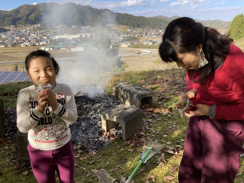 親子山村移住体験で昨年の夏に来たNさん親子。うれしい再度の訪問がありました。お菓子と手紙のかわいいプレゼントを持ってきてくれました。ちょうど、我が家の庭は落ち葉でいっぱい。「落ち葉焚きやってみる?」「うん!」早速、親子でとりかかりました。