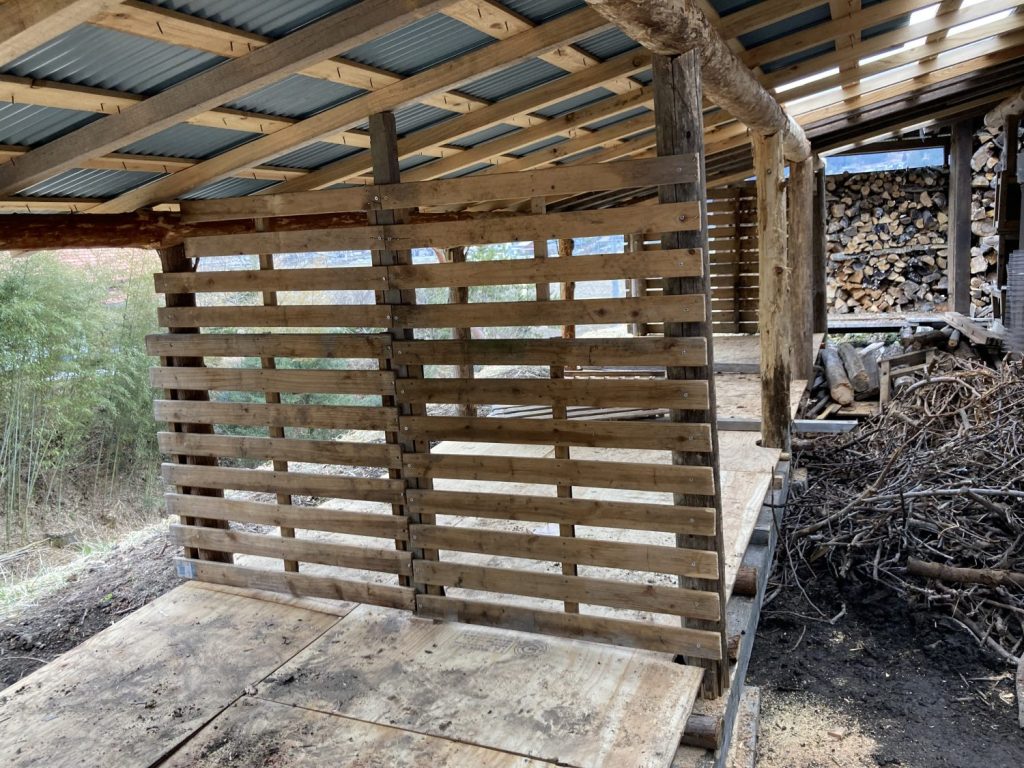 小学校からいただいた廃棄されたすのこ板と、押し入れで使っていた不要なすのこ板を利用して、0円で薪小屋の間仕切りを作ってみました。足りない部材は、製材所からでた端材から、幅8cmで切り出しました。