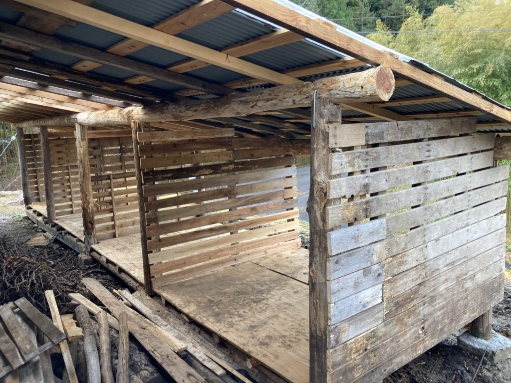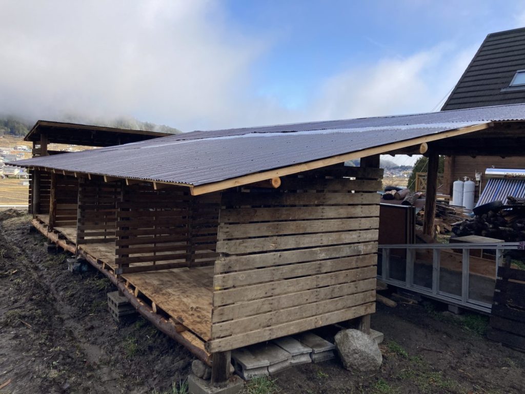 既存の小屋と連結して、大屋根になっています。今後、ここに太陽パネルをあげ、オフグリッドソーラーにします。