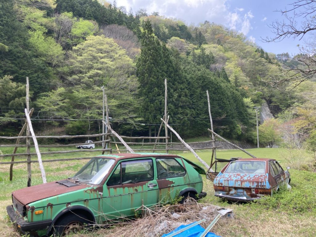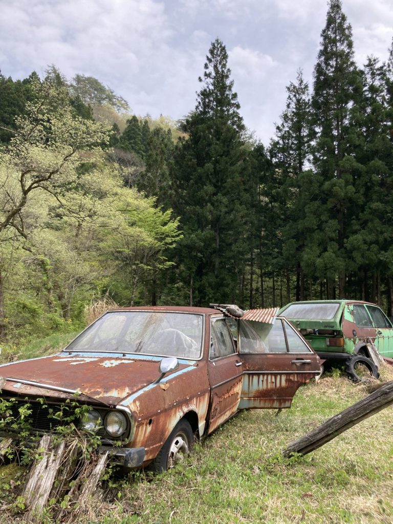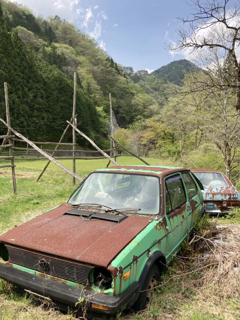 途中、畑の中にかつての名車が錆びついていました。周りの新緑とのコントラストがなんとも。