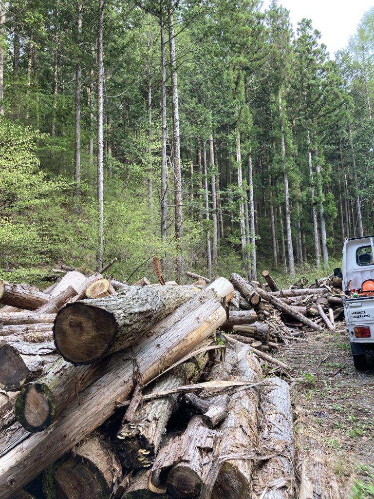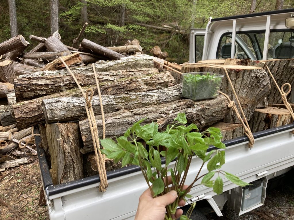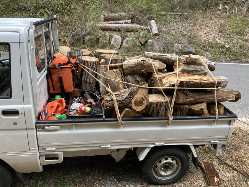 実は薪をいただきに来たのです。その道中、あまりにもきれいな新緑の山々、花々に感動して撮影しました。ここからが本当の目的です。やはり薪活には軽トラが必需品ですね。この楢の原木がお目当てです。