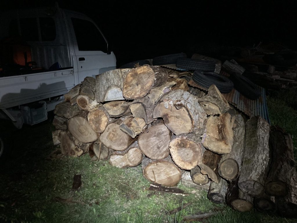 何とか無事に運び終えました。もう真っ暗です。お疲れ様でした。木材を提供いただいたMさんありがとうございました。地域の方々とつながることで、17年間、薪代は0円です。材木や支障木の片付けをすると喜ばれます。そして、どんどん親しい人が増えていくんです。田舎暮らしは持ちつ持たれつで成り立っています。薪や山菜もおすそ分けしています。