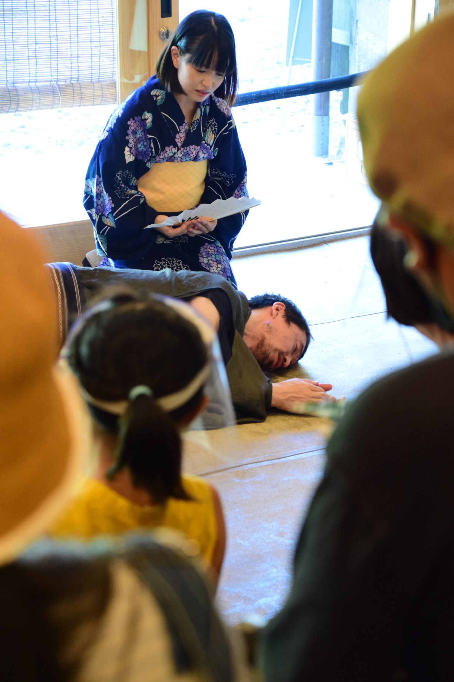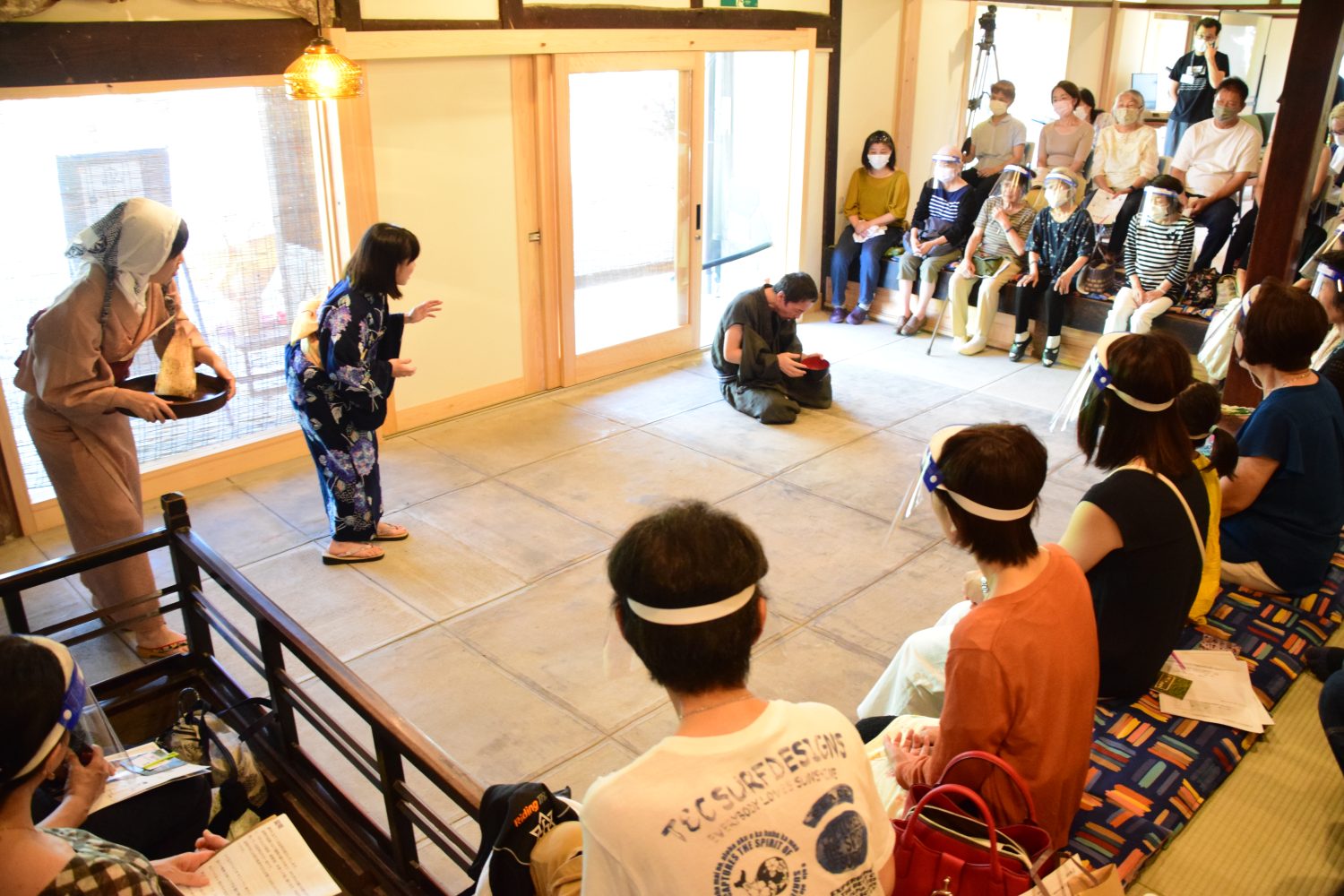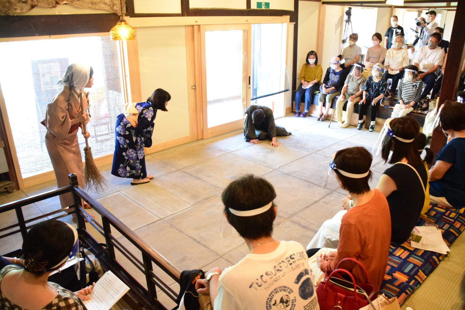 NAGANO ORGANIC AIRの活動の一環として約1年半かけて阿南町新野を舞台に制作された短編戯曲「新野物語」の本公演が、7月30日に阿南町新野の 曹洞宗瑞光院、31日に売木村の うるぎHalo!岡田屋で行われました。新野公演は約40名(昼1回)、売木公演は約80名(昼夜2回)のお客様が入り、どちらも満員御礼。山村で行われることの珍しい生の演劇を楽しみました。コロナ感染が広がる中、どちらの公演も俳優・スタッフは、抗原検査で陰性を確認し、お客様の体温チェック、マスク、フェイスシールド、会場の換気など感染対策を万全にして上演されました。