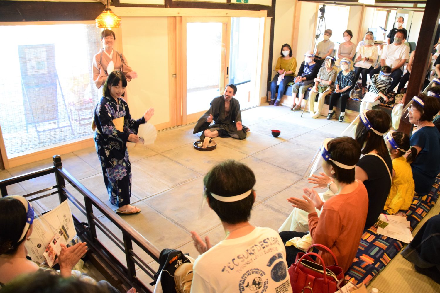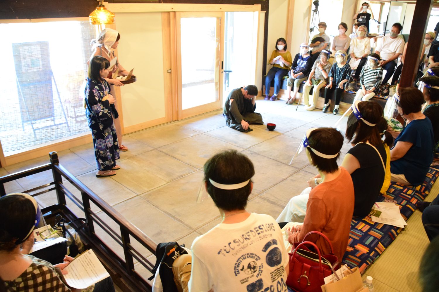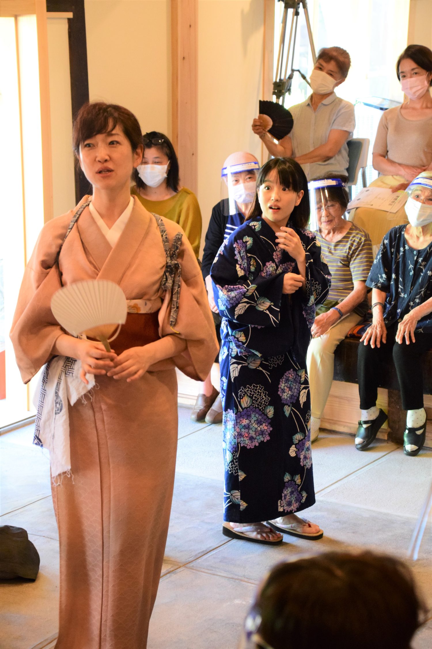 NAGANO ORGANIC AIRの活動の一環として約1年半かけて阿南町新野を舞台に制作された短編戯曲「新野物語」の本公演が、7月30日に阿南町新野の 曹洞宗瑞光院、31日に売木村の うるぎHalo!岡田屋で行われました。新野公演は約40名(昼1回)、売木公演は約80名(昼夜2回)のお客様が入り、どちらも満員御礼。山村で行われることの珍しい生の演劇を楽しみました。コロナ感染が広がる中、どちらの公演も俳優・スタッフは、抗原検査で陰性を確認し、お客様の体温チェック、マスク、フェイスシールド、会場の換気など感染対策を万全にして上演されました。