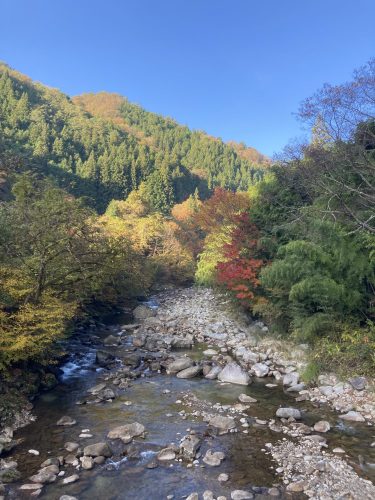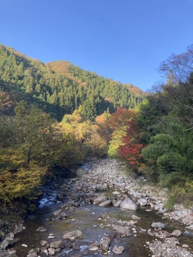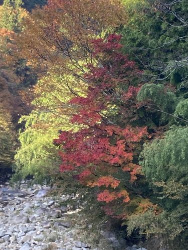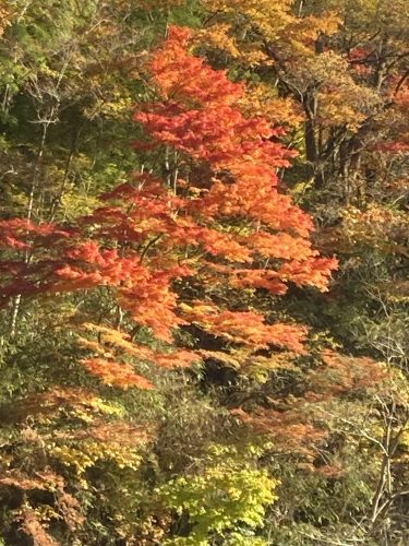 赤と黄色と緑と青空のコントラストがきれいです。人工物がないのがすばらしい。