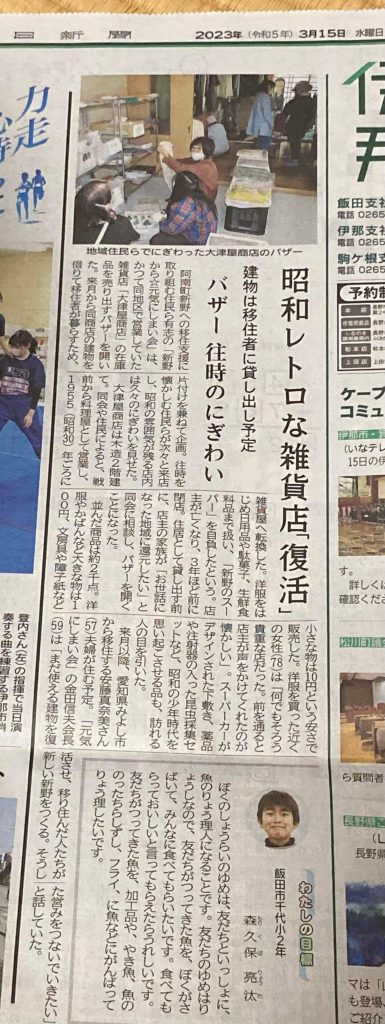 新野から★元気にしまい会の空き家片付け移住支援イベントの「大津屋バザー」が3月15日付の信濃毎日新聞に載りました。事前に新聞折り込み広告も行った効果で、地元の方中心に、延べ150人がご来店し、二日間とも大盛況の賑わいでした。約2000点の商品も完売。