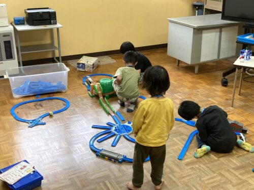 さあ!和合小学校体験開始! 空き教室にはプラレールが! 「わくわくタイム」では子どもが好きなことに取り組めるのです。