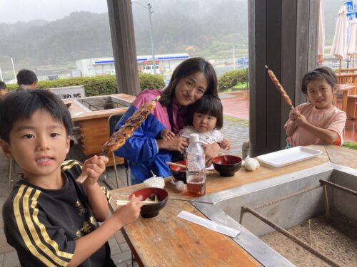 クルミ醤油たれをつけて炭火で焼きたて! 子どもたちはぺろりと1本たいらげました。
