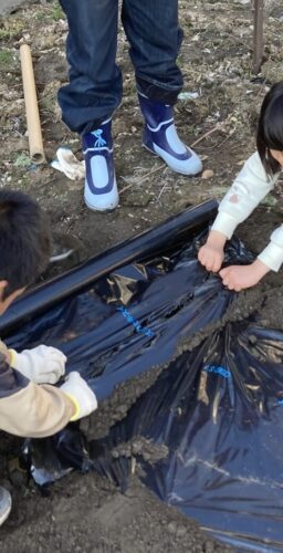 家庭菜園がついている家もあります。マルチシート敷きを伝授。野菜の苗を買ってきて植えました。