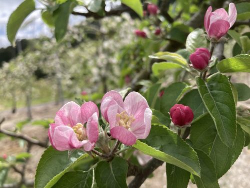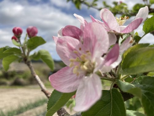 南信州 阿南町 新野高原では、りんごの花が見頃です。ミツバチが盛んに蜜を吸い、受粉をしてくれています。道の駅から東側の親水公園付近のリンゴ園で撮影しました。