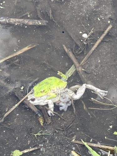 おっとお取込み中失礼しました。畔を切ったら、交尾・産卵中のカエルのつがいを追い出してしまいました。
