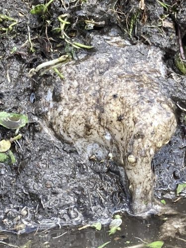 畔を切ると土の中からシュレーゲルアオガエルの卵が出てきました。黄色い卵が見えます。