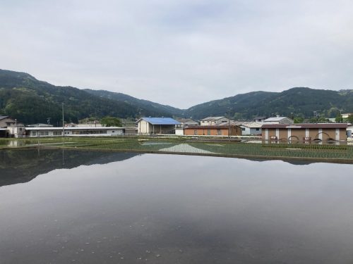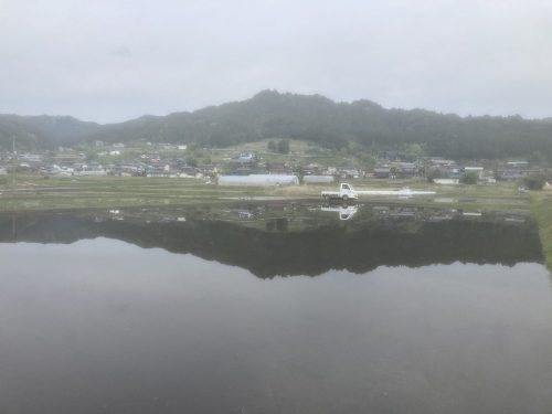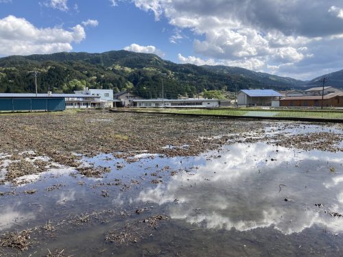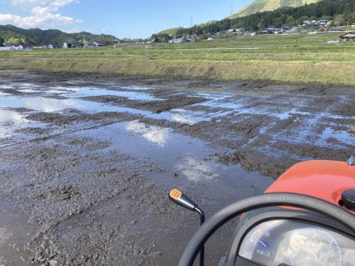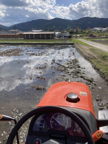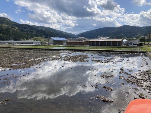 いよいよ荒代掻き開始。田起こしの済んだ田んぼに水を入れて少し土が見えるくらいにします。